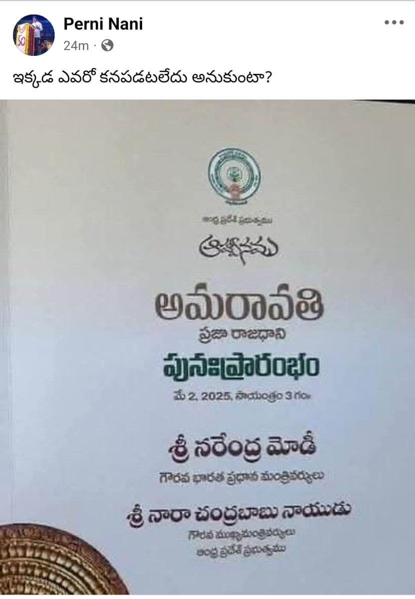 ఆంధ్ర‌ప్ర‌దేశ్ రాజ‌ధానిగా అమ‌రావ‌తిని పున‌రుద్ధ‌ర‌ణ చేయాల‌ని ప్లాన్ చేసిన చంద్ర‌బాబు ఈ కార్య‌క్ర‌మానికి మే 2న శ్రీకారం చుట్టారు. ఈ వేడుక‌కు కూట‌మిలో భాగంగా ఉన్న ప్ర‌ధాని న‌రేంద్ర మోదీ ముఖ్య అతిథిగా రాబోతున్నారు. కార్య‌క్ర‌మానికి త‌గ్గ‌ట్టు ఆహ్వానాలు కూడా సిద్ధం అయ్యాయి. అయితే ఆహ్వాన ప‌త్రిక‌లో ఎక్క‌డా ప‌వ‌న్ పేరు లేక‌పోవ‌డం ప‌లు సందేహాల‌కు దారి తీస్తోంది. పైగా ఇలాంటి ఘ‌ట‌న‌లు ఎప్పుడెప్పుడు జ‌రుగుతాయా అని వైసీపీ ఎదురుచూస్తుంటుంది. అనుకున్న‌ట్లే ఆ పార్టీ నేత పేర్ని నాని చేతికి ఆహ్వానం అందింది. ఆ ఆహ్వానంలో ప‌వ‌న్ పేరు లేక‌పోవ‌డంతో.. ఇక్క‌డ ఎవ‌రో క‌న‌బ‌డుట లేద‌నుకుంటా అంటూ వ్యంగ్యంగా సోష‌ల్‌మీడియాలో కామెంట్ కూడా చేసారు.